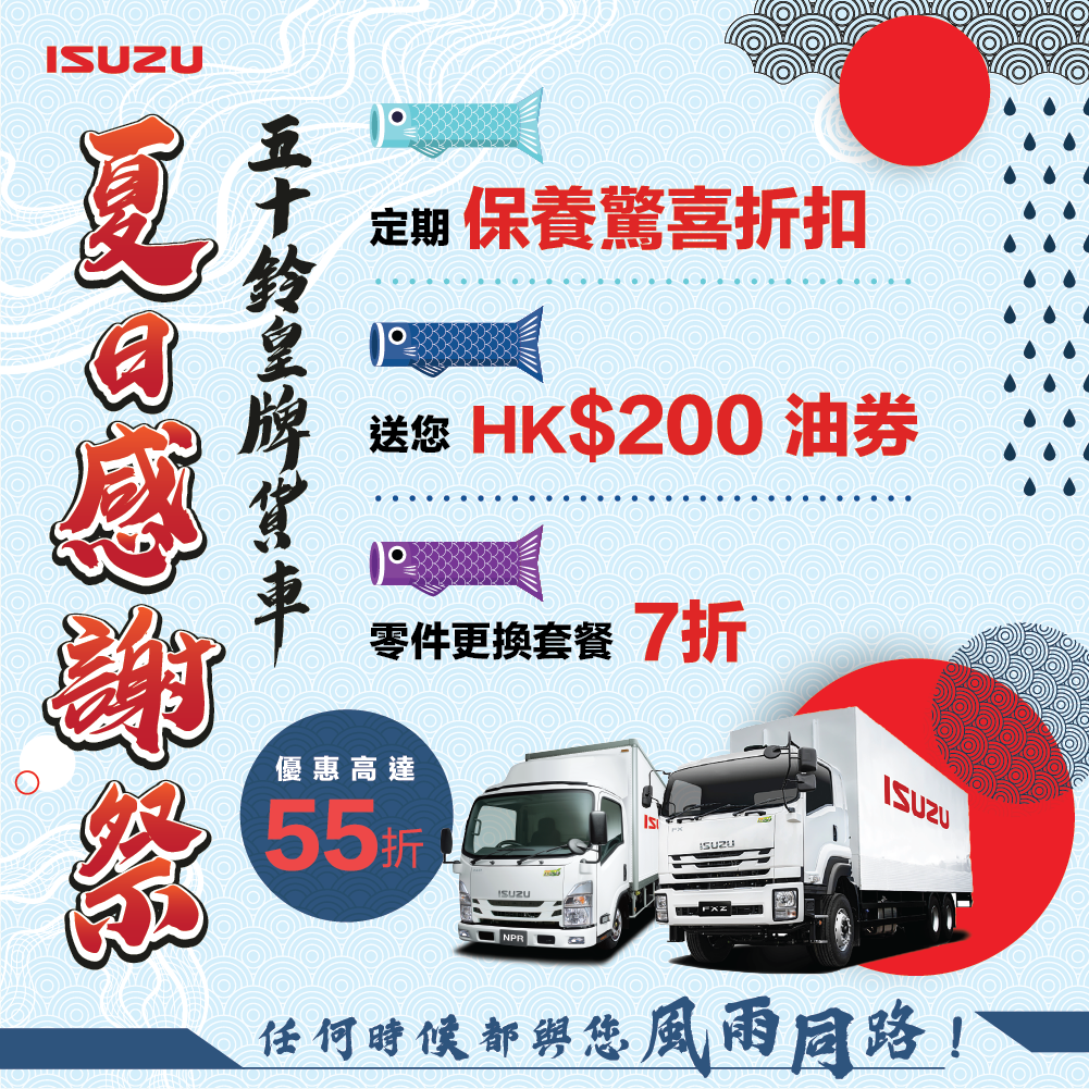 今個夏天,我們特別推出「夏日感謝祭」回饋車主們,多項服務優惠一減再減,折扣低至 55 折!另精選零件更換套餐更可享 7 折,讓您於營運旅程中輕鬆獲得最大保障。優惠期內進行保養,再送您 HK$200 油劵!